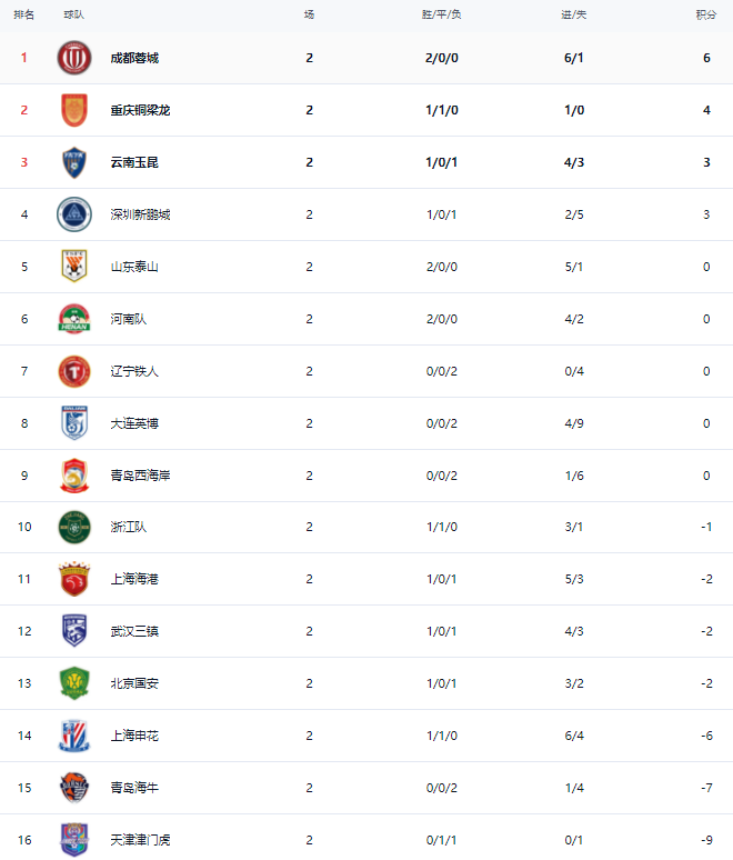 在积分榜上,成都蓉城2战全胜,拿到6分,登顶积分榜。重庆铜梁龙拿到4分,排名第2。云南玉昆和深圳新鹏城都是3分,排名第3和第4名。山东泰山虽然是两连胜,但因为被罚分的问题,导致现在的总积分是0分,排名第5。上海海港赢球之后,总积分是负2分,升到第11名。北京国安1胜1负,也是负2分,排名第13。上海申花负6分,排名第14。
